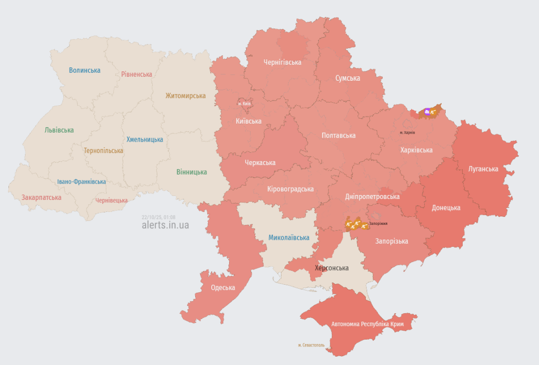 Актуальна мапа повітряних тривог України станом на 01:08 / Джерело: https://alerts.in.ua/