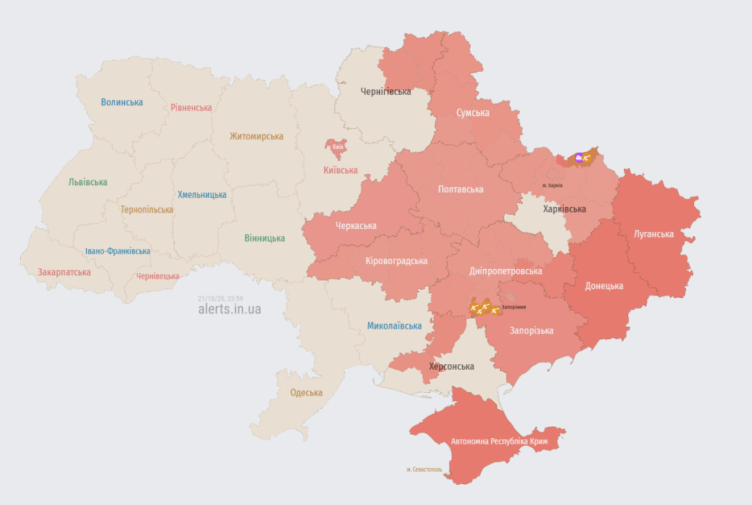 Актуальна мапа повітряних тривог України станом на 23:59 / Джерело: https://alerts.in.ua/