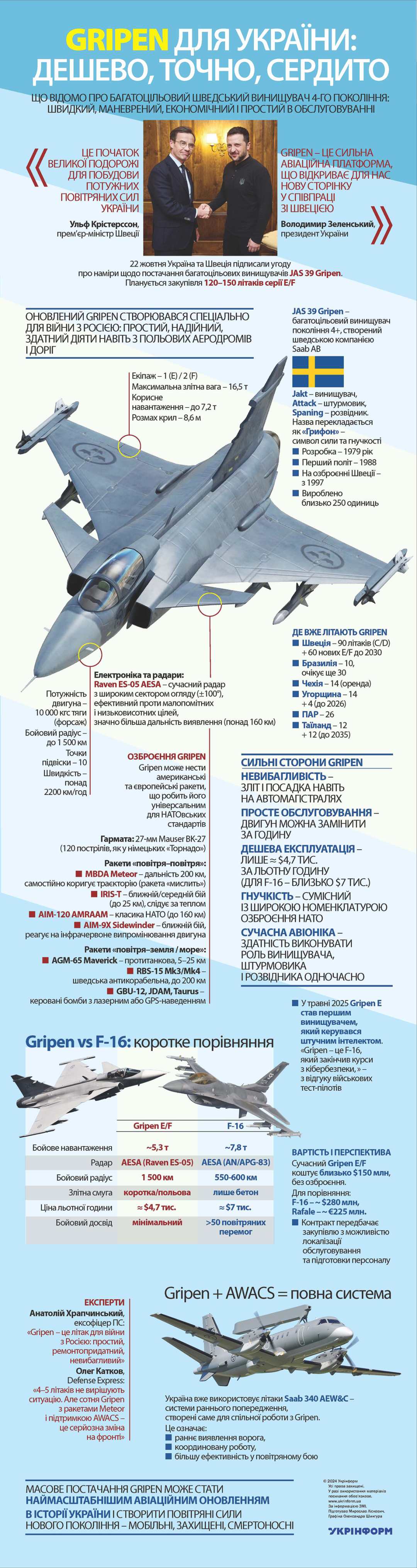 Новини зі «збройового» фронту реально потішили. Якщо меморандум про наміри, підписаний Президентом України і прем’єр-міністром Швеції не залишиться просто папером і Україна таки отримає 100-150 винищувачів Гріпен (більшість «з нуля», тобто нових), то це буде справжній прорив, в України будуть найчисельнішій найсильніші ВПС у регіоні. Що це з точки зору посилення обороноздатності, вартості (машина+обслуговування) і ТТД в порівнянні з іншими винищувачами 4-го покоління видно з інфографіки.