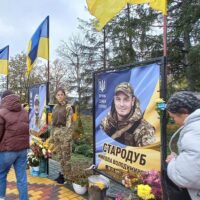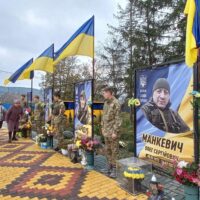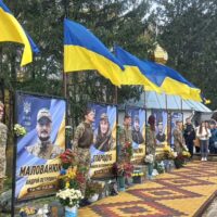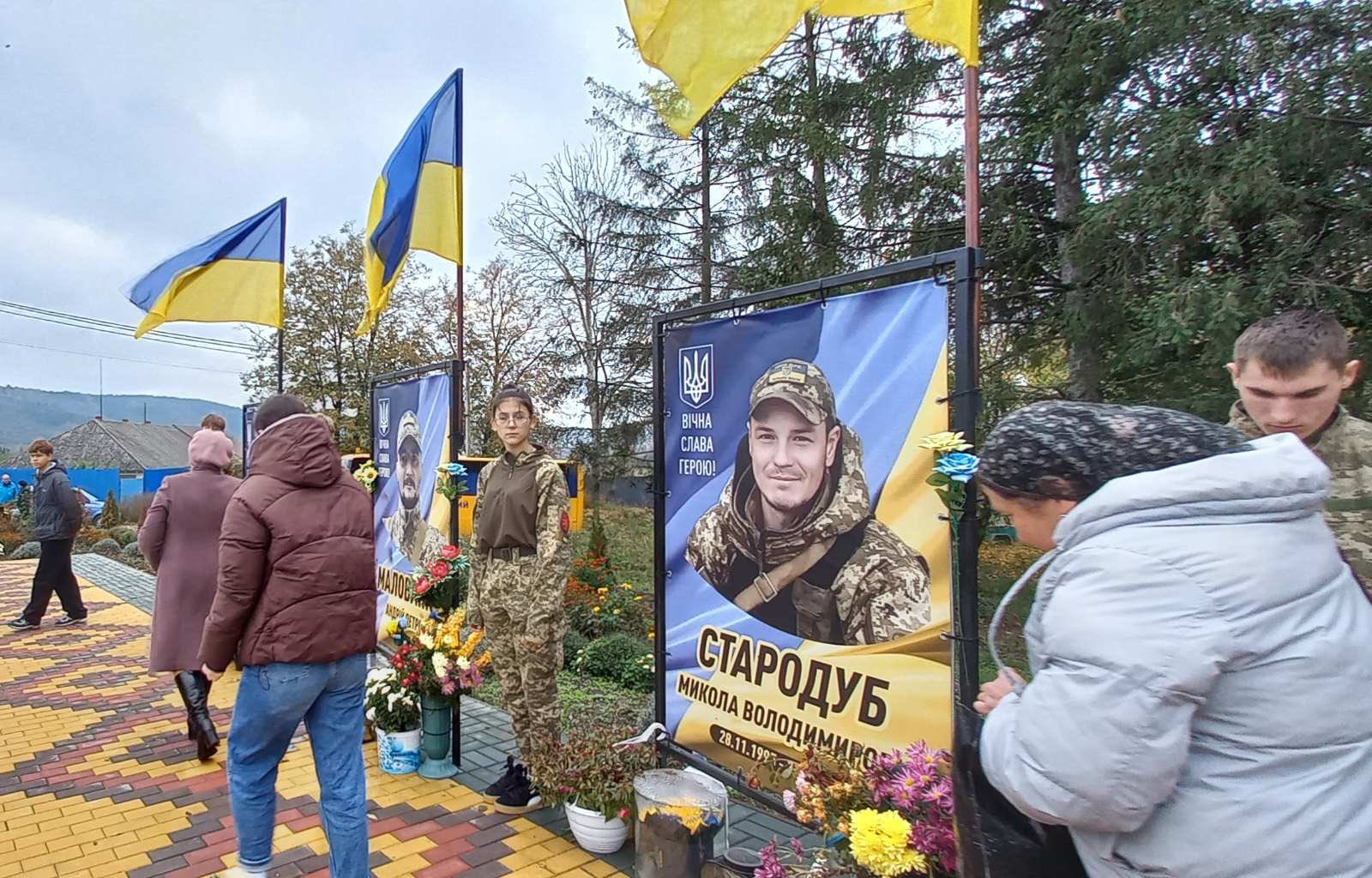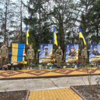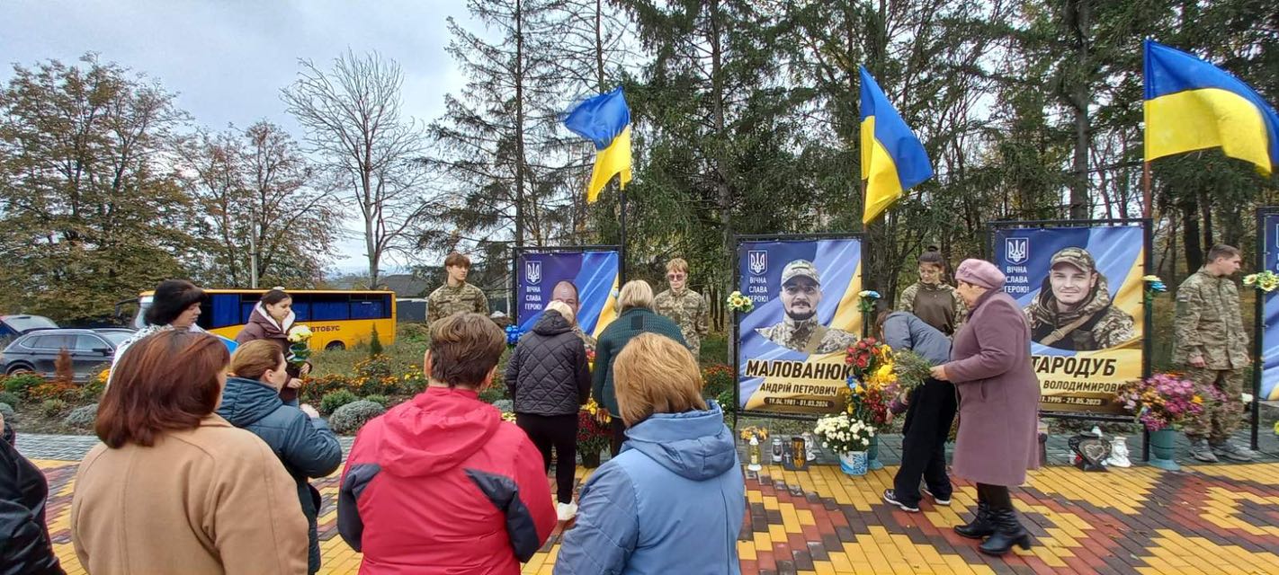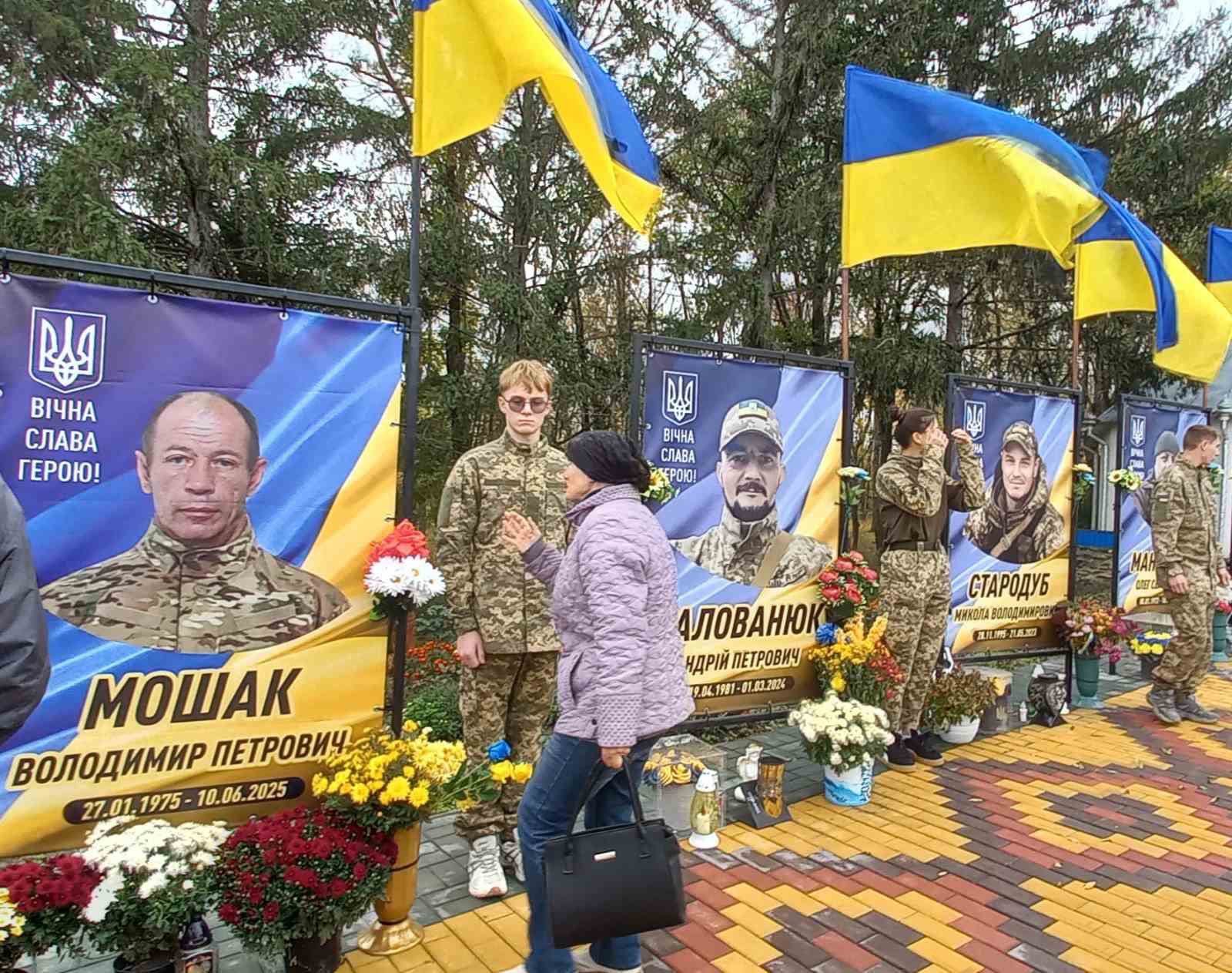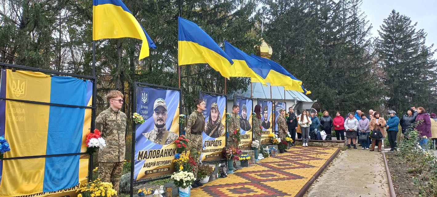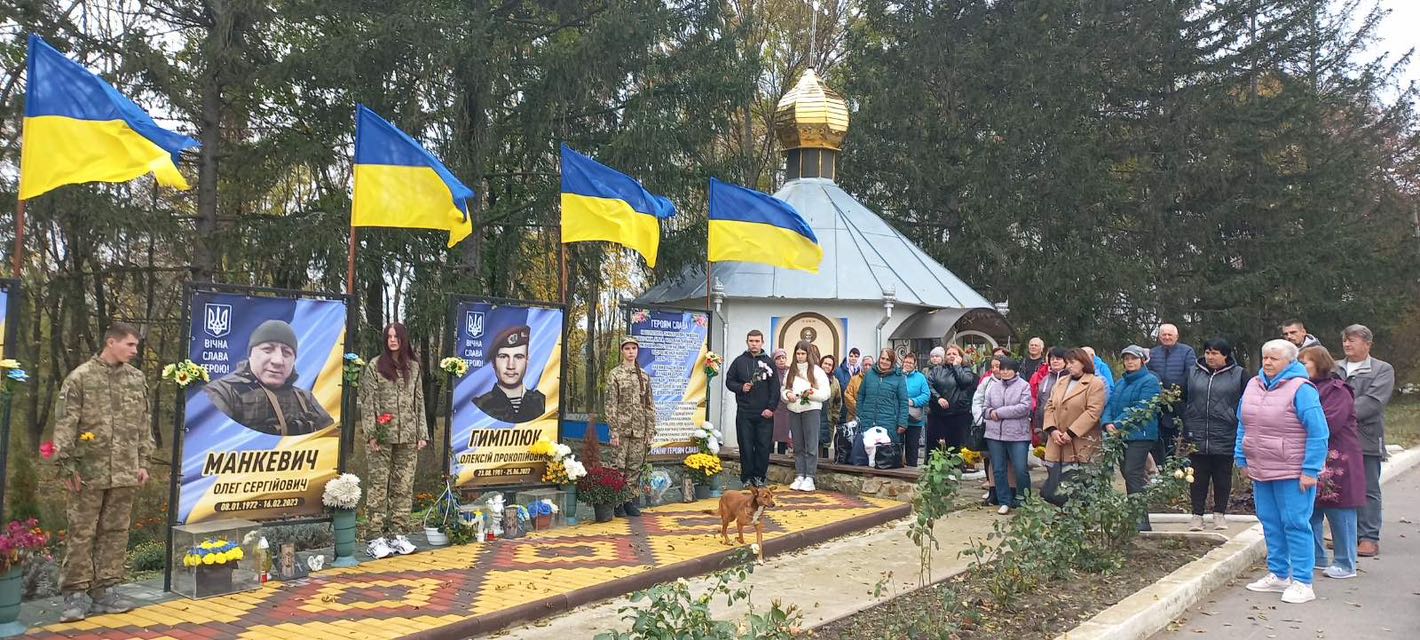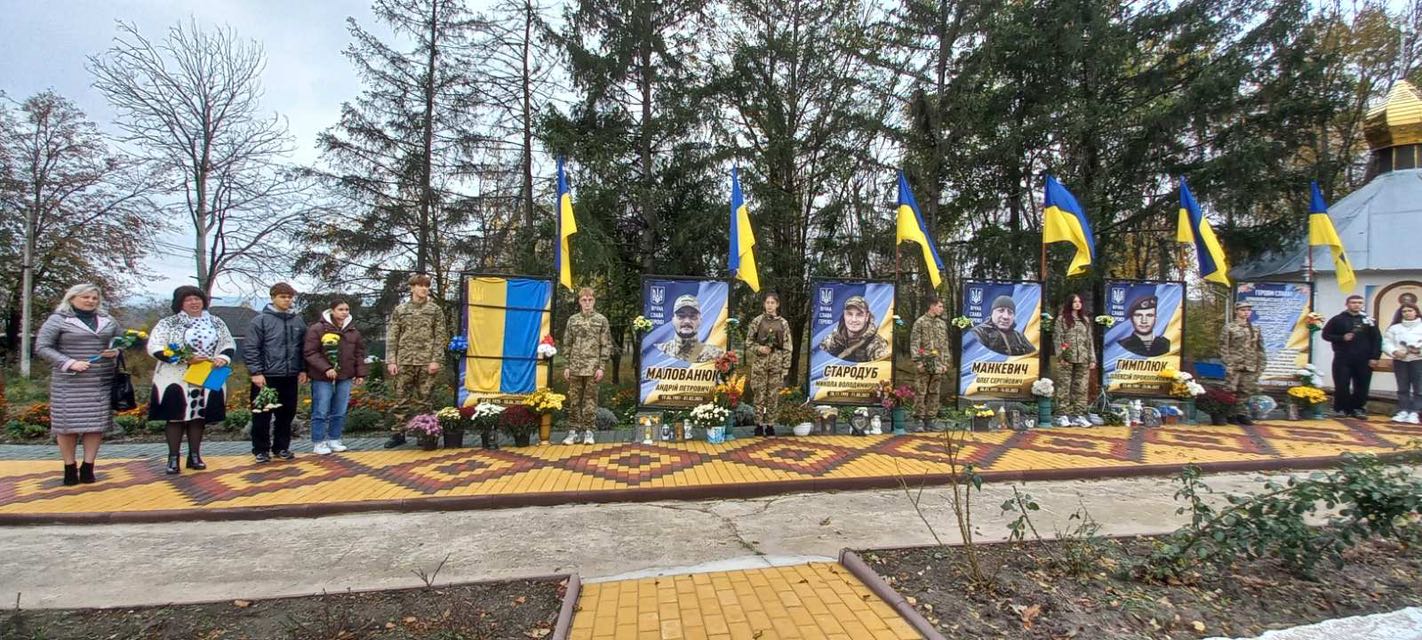 У селі Ожеве вже майорять синьо-жовті стяги над світлинами полеглих воїнів — Олега Манкевича, Олексія Гимлюка, Андрія Малованюка, Миколи Стародуба.
