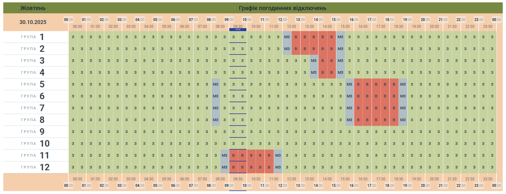Клітинки сірого кольору в графіку – це той час, коли кожна група може бути заживлена, залежно від змін у лімітах споживання або зменшенню споживанню електроенергії. Також години сірої зони використовують як запасний час для перемикання між групами, щоб виконати необхідні технічні та безпекові дії.
