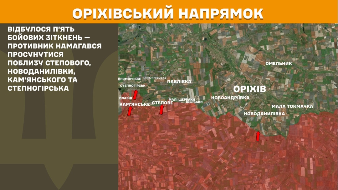 На Оріхівському напрямку відбулося п’ять бойових зіткнень — ворог намагався просунутися поблизу Степового, Новоданилівки, Кам’янського та Степногірська.