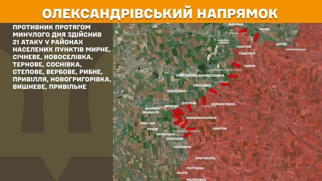 На Олександрівському напрямку ворог протягом минулого дня здійснив 21 атаку у районах населених пунктів Мирне, Січневе, Новоселівка, Тернове, Соснівка, Степове, Вербове, Рибне, Привілля, Новогригорівка, Вишневе, Привільне.