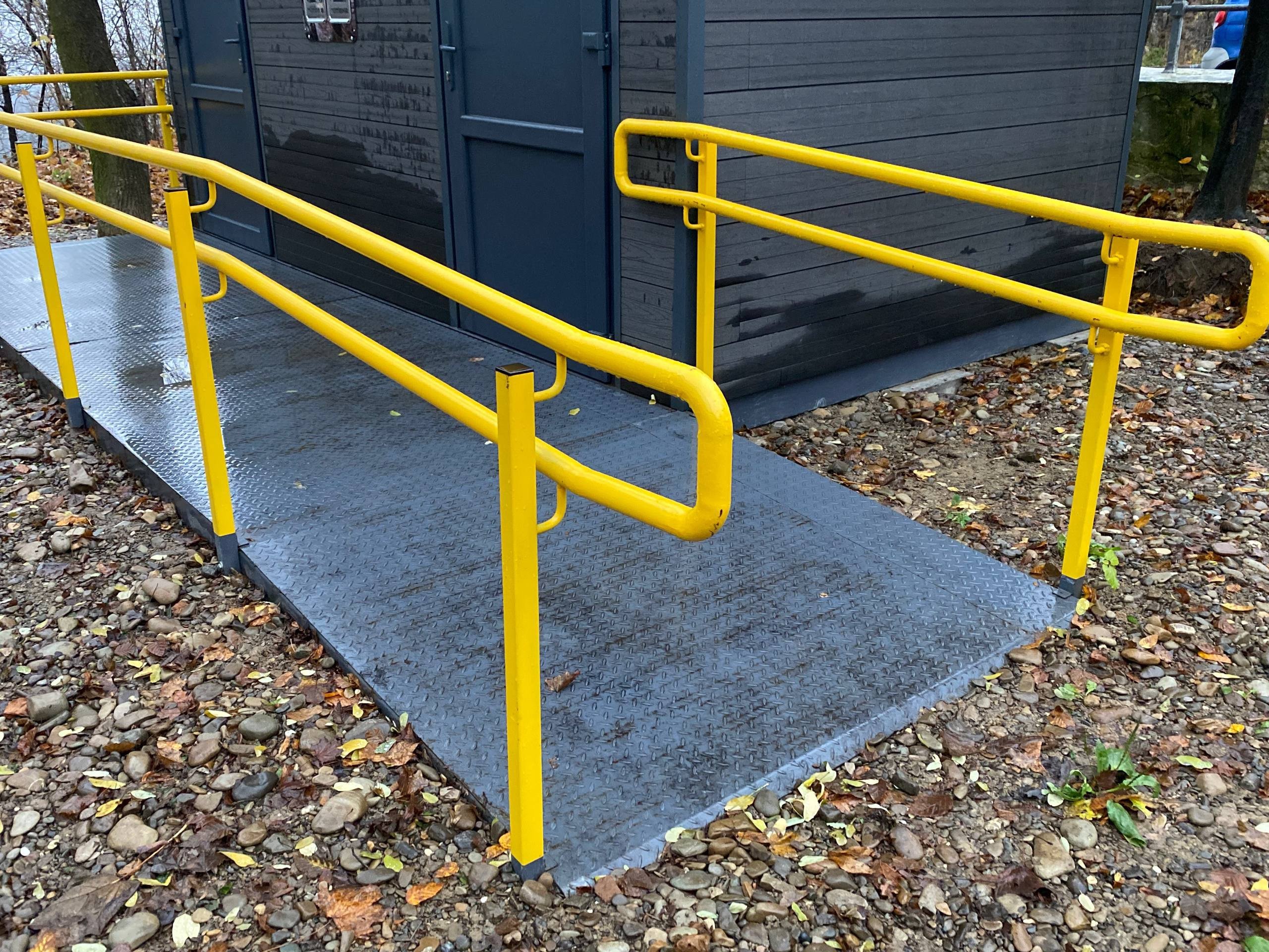 Вбиральня є інклюзивною: для людей з інвалідністю передбачили пандус та окрему кабіну, обладнану сповивальним столиком для малюків.