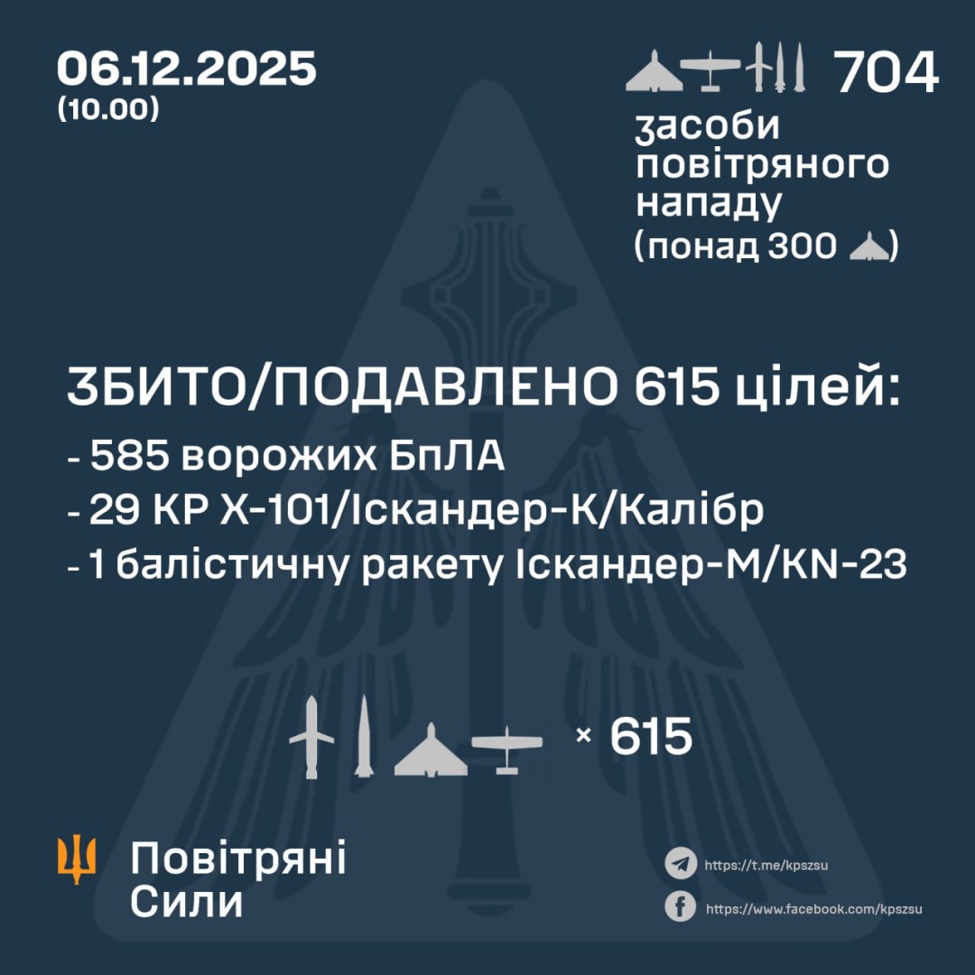За попередніми даними, станом на 10.00 суботи, 6 грудня, ППО збила / подавила 615 повітряних цілей: