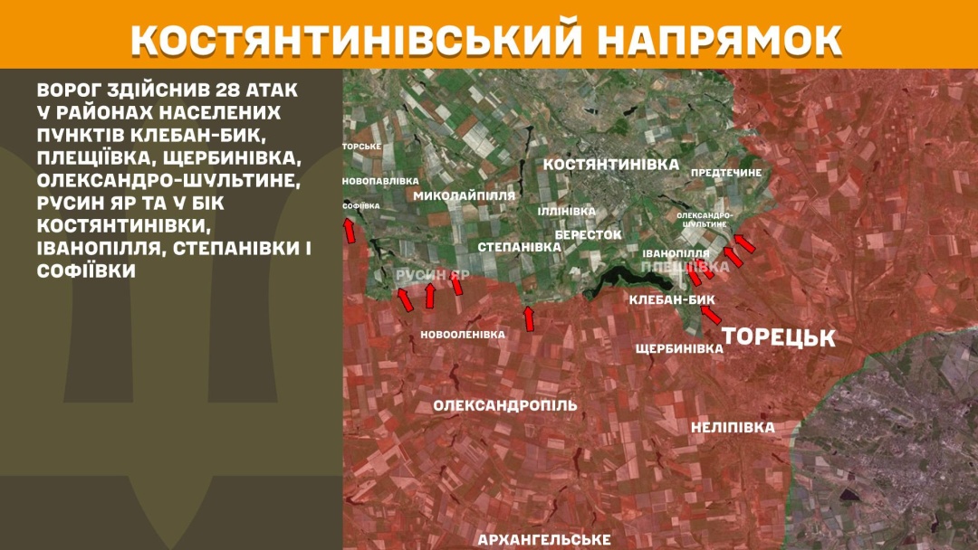 На Костянтинівському напрямку ворог здійснив 28 атак у районах населених пунктів Клебан-Бик, Плещіївка, Щербинівка, Олександро-Шультине, Русин Яр та у бік Костянтинівки, Іванопілля, Степанівки і Софіївки.