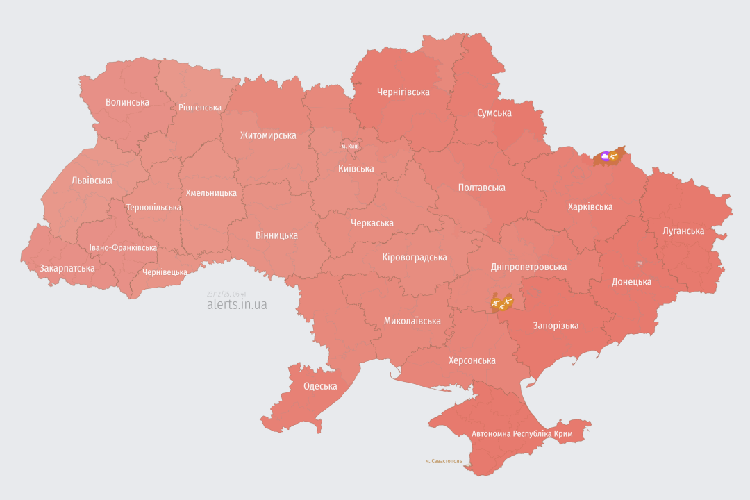 У столиці та всіх областях України оголошена повітряна тривога через загрозу російських ударних безпілотників і ракет.