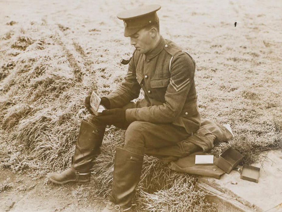 Британський солдат відкриває подарункову коробочку. Ймовірно, постановочна зйомка. Фото: wikipedia