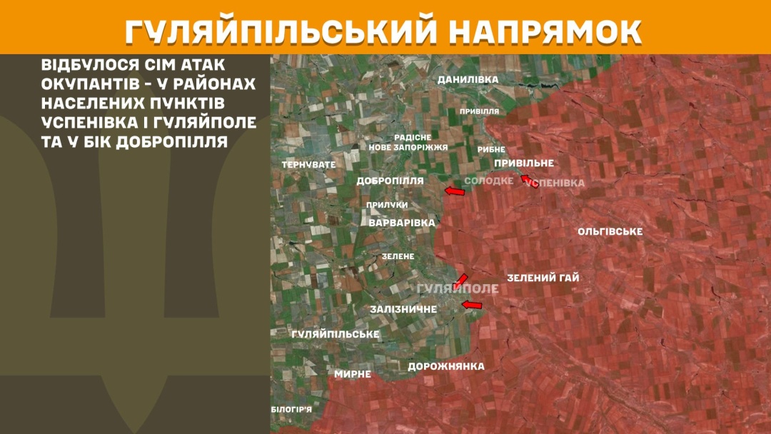 На Гуляйпільському напрямку відбулося сім атак загарбників – у районах населених пунктів Успенівка і Гуляйполе та у бік Добропілля.