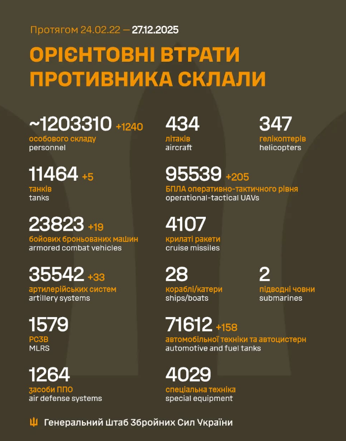 Загальні бойові втрати російських військ з 24 лютого 2022 року по 27 грудня 2025 року на війні проти України становлять близько 1 203 310 осіб, з них 1 240 осіб – за минулу добу.