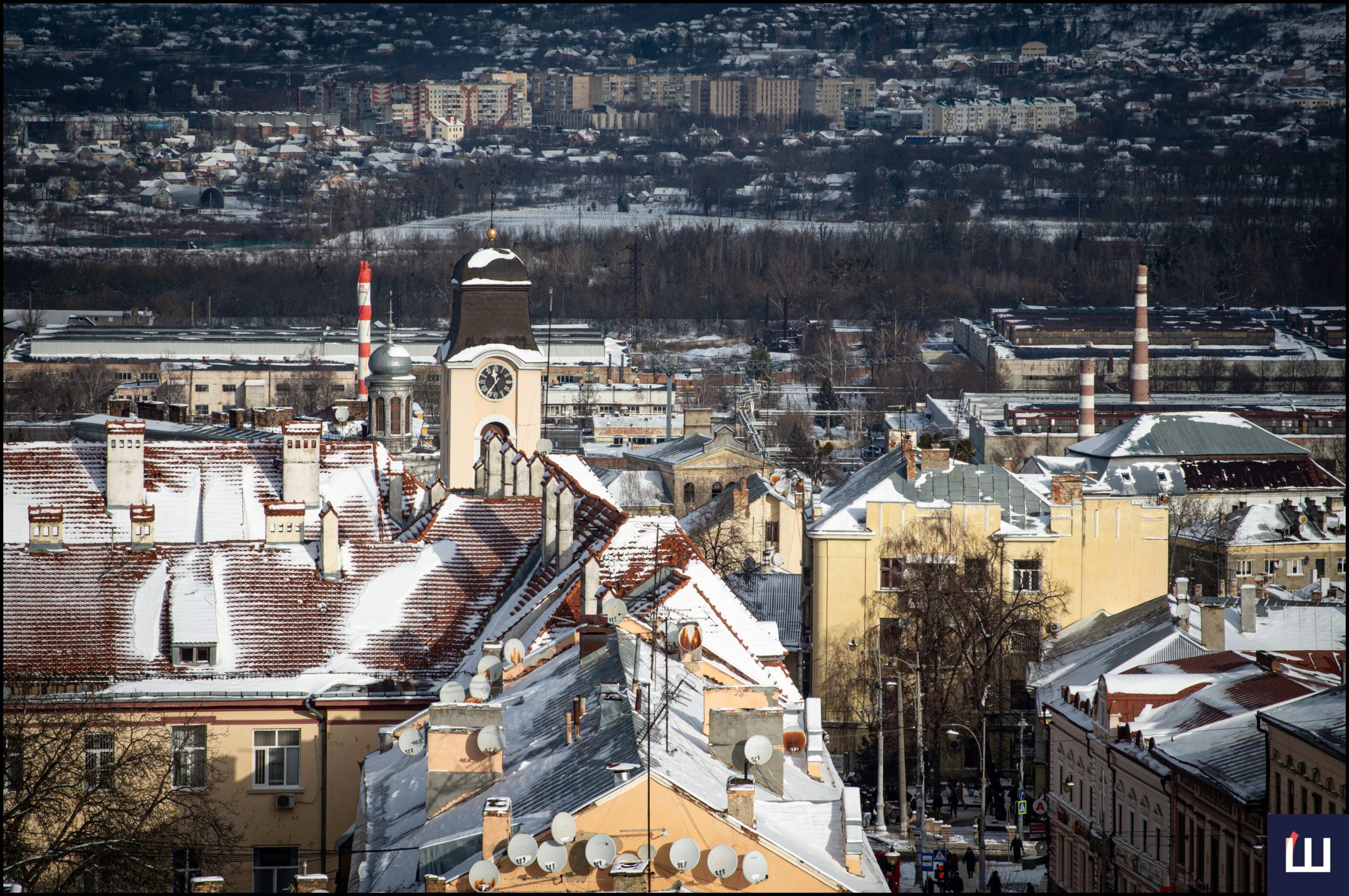 Сьогодні Чернівці виглядають по-особливому: засніжені дахи, вулиці та житлові квартали. Історичний центр міста, старі райони і схили вкриті снігом.