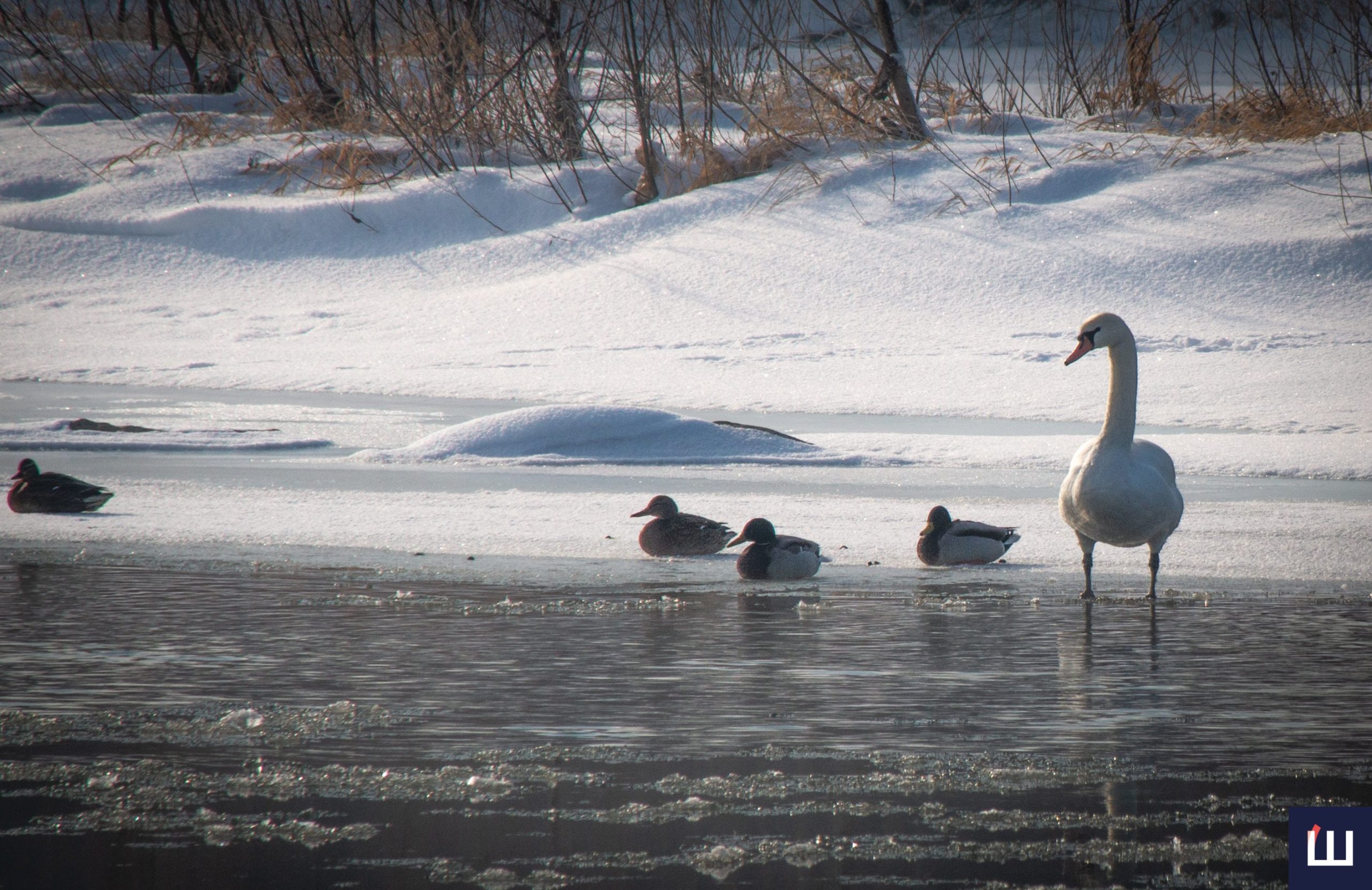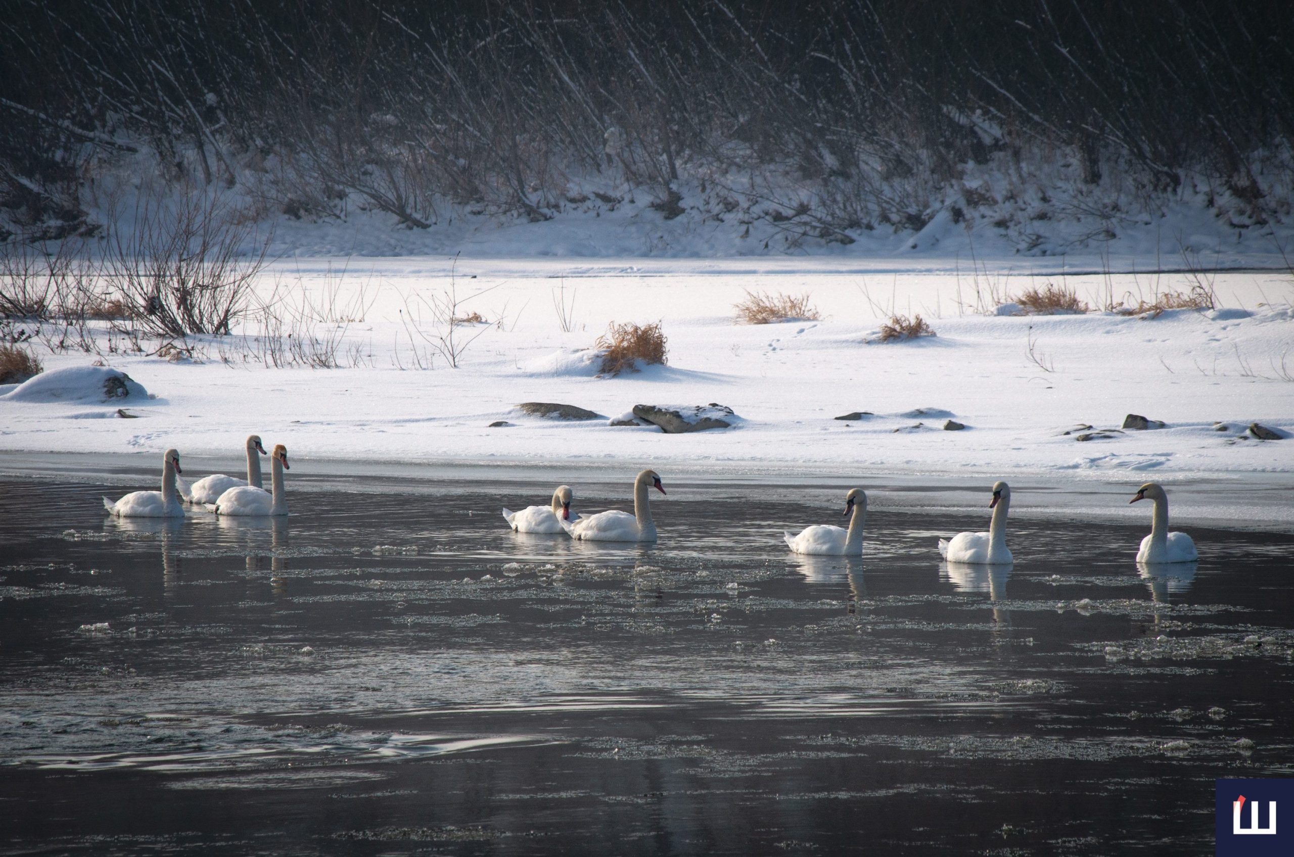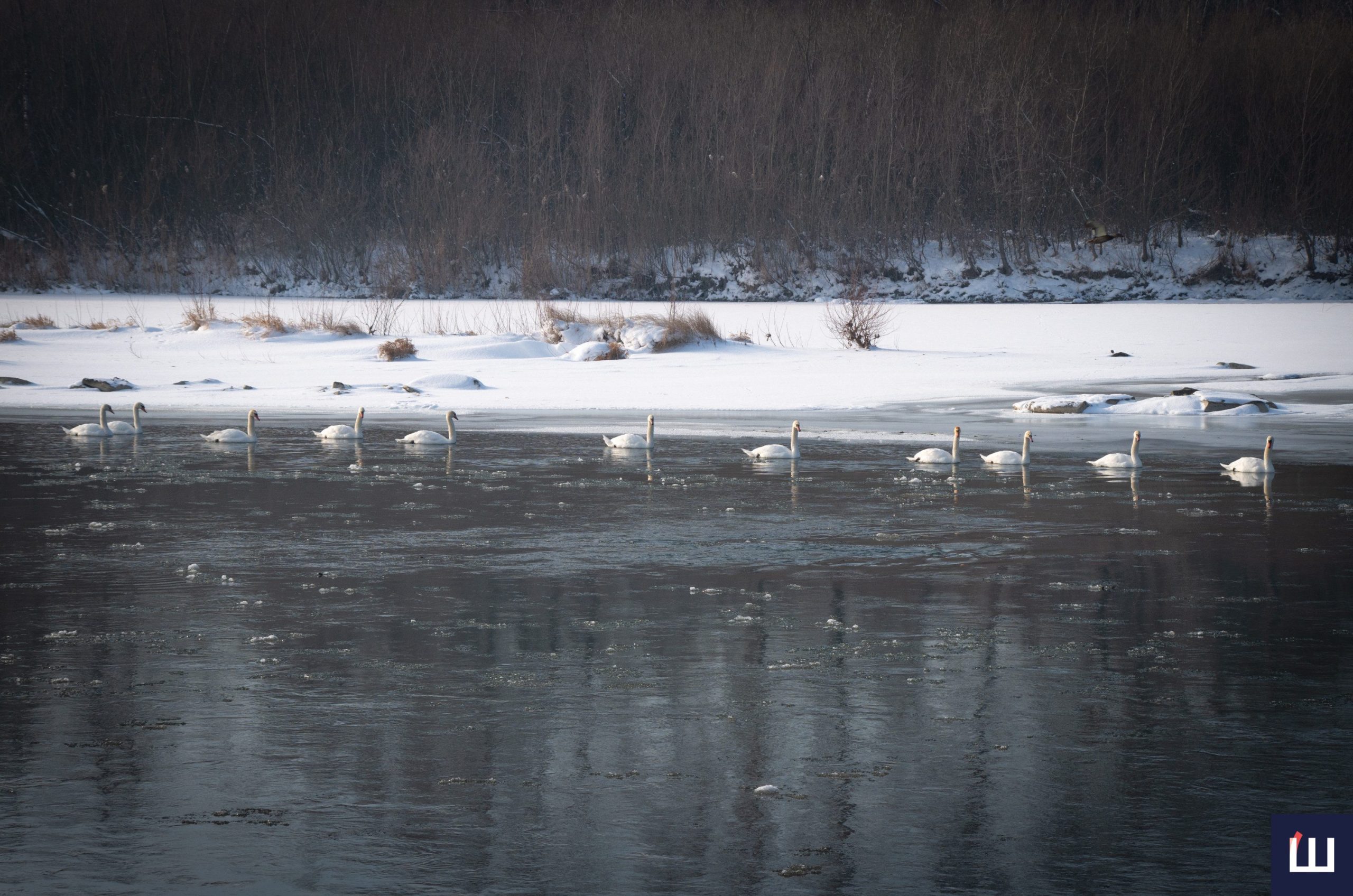 Фотограф «Шпальти» Тарас Піц зазнімкував білосніжних лебедів та диких качок, які попри мінусову температуру мирно ніжилися на сонці у воді, на островах і на берегах річки.