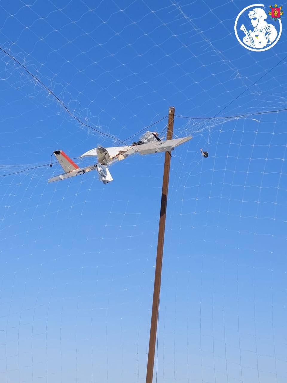 «Антидронові «пастки» в дії на Запоріжжі. На фото — результат роботи захисних «тунелів» на важливих логістичних шляхах області. Російський ударний БпЛА «Молнія» не зміг дістатися цілі, заплутавшись у сітці», – написав він.