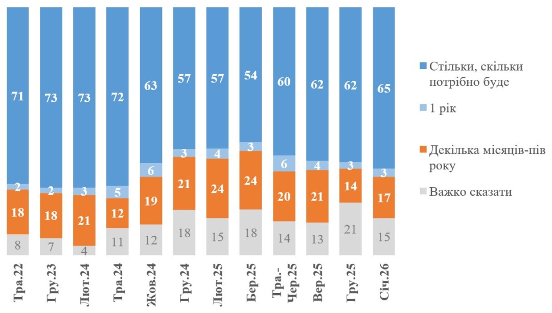 При цьому більшість українців (65%) продовжують відповідати, що вони готові терпіти війну стільки, скільки потрібно. Про більш короткий період (пів року чи декілька місяців) говорять 17% респондентів.