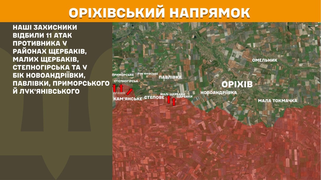 На Оріхівському напрямку українські захисники відбили 11 ворожих атак у районах Щербаків, Малих Щербаків та Степногірська, у бік Новоандріївки, Павлівки, Приморського та Лук’янівського.