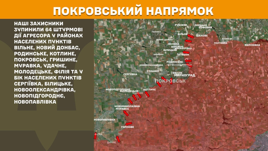 На Покровському напрямку українські оборонці зупинили 64 штурмові дії ворога в районах Вільного, Нового Донбасу, Родинського, Котлиного, Покровська, Гришиного, Муравки, Удачного, Молодецького та Філії, у бік Сергіївки, Білицького, Новоолександрівки, Новопідгороднього й Новопавлівки.