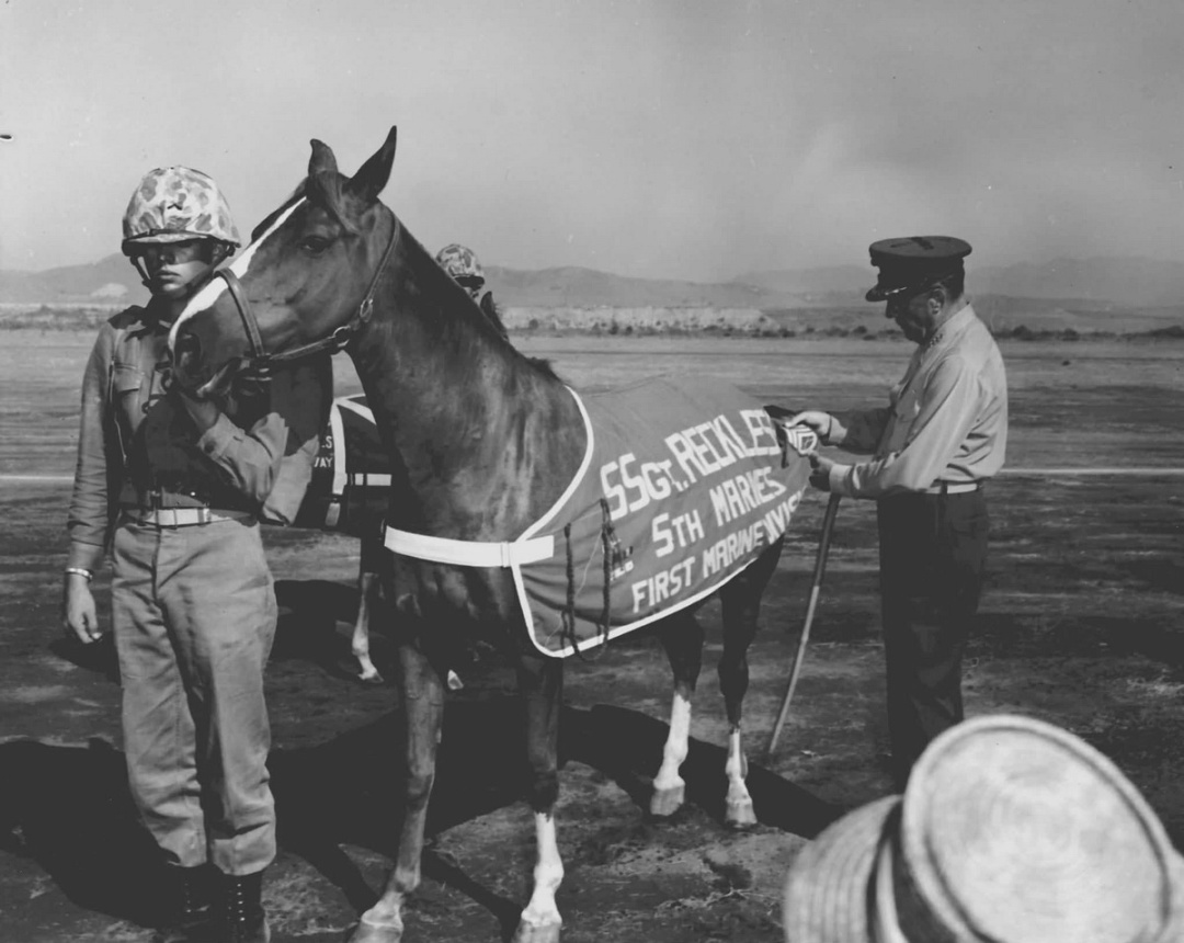 Сержант Реклесс, кобила монгольської породи, служила в Корпусі морської піхоти США під час Корейської війни (1950-1953). Її купили за 250 доларів у молодого корейця. Сумна іронія долі: йому терміново потрібні були гроші на протез – сестра наступила на міну і втратила ногу, а американським морпіхам конче була потрібна в’ючна тварина, щоб перевозити нові міни. Реклесс виявилась надзвичайно розумною й відважною – не боялася бою і дуже швидко запам’ятовувала нові маршрути, по яких могла йти сама, без супроводу. Якось у березні 1953, під час битви за аванпост Вегас, вона 51 раз виходила в самостійний рейд задля поповнення боєприпасами кількох підрозділів на передовій. А ще транспортувала в тил поранених, перевозила провізію та допомагала прокладати телефонні кабелі. За час своєї дев’ятимісячної служби кобила була двічі поранена. Реклесс вирізнялася не тільки відвагою, але й товариською вдачею. Вона вільно пересувалася табором, їла абсолютно все, що давали: навіть яєшню, картоплю фрі й шоколадні батончики; пила пиво і кока-колу. Любила бути в центрі уваги. Коли бачила, що на неї не звертають увагу, могла продертися крізь гурт морпіхів, стати посередині й голосно заіржати. Після демобілізації Реклесс відзначили багатьма нагородами, а журнал LIFE включив до сотні героїв Америки всіх часів. У 1959 її офіційно підвищили до старшого сержанта. Вона померла в травні 1968 року, встигнувши ще й ожеребитись чотирма лошатами. На її честь у США відкрито декілька пам’ятників, а в стайнях базового табору морської піхоти «Пендлтон» було встановлено меморіальну дошку.