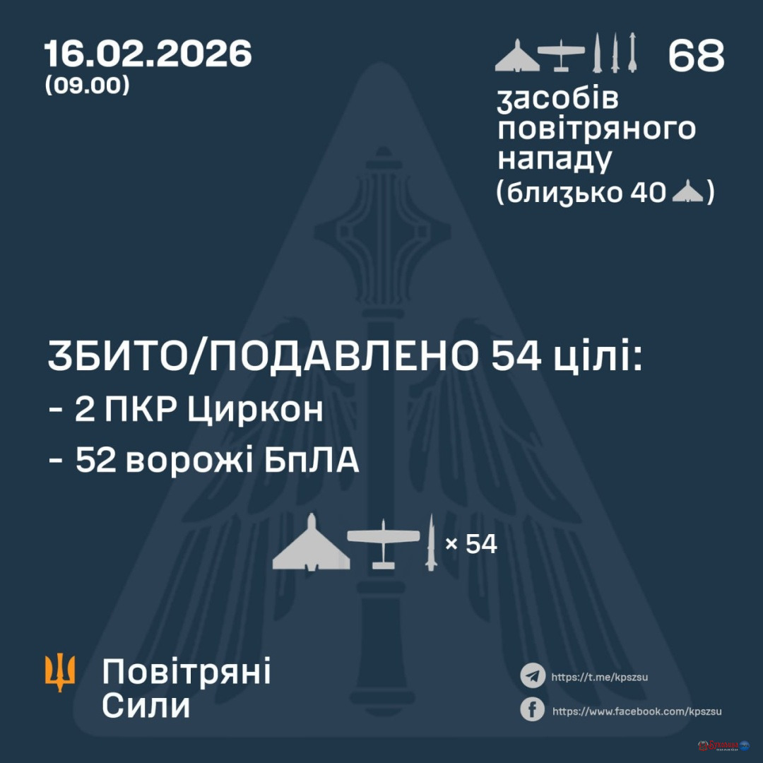 Українська ППО збила дві ракети «Циркон» та 52 ворожі дрони 16.02.2026 09:37 Укрінформ У ніч на 16 лютого Сили оборони уразили дві протикорабельні ракети Циркон та 52 ворожі БПЛА. Як передає Укрінформ, про це в Телеграмі повідомляє пресслужба командування Повітряних сил ЗСУ. «Станом на…