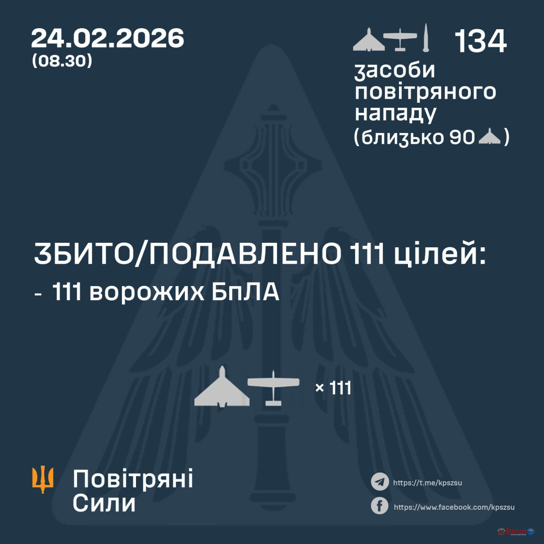 За попередніми даними, станом на 08:30 вівторка, 24 лютого, ППО збила / подавила 111 дронів на півночі, півдні та сході України.