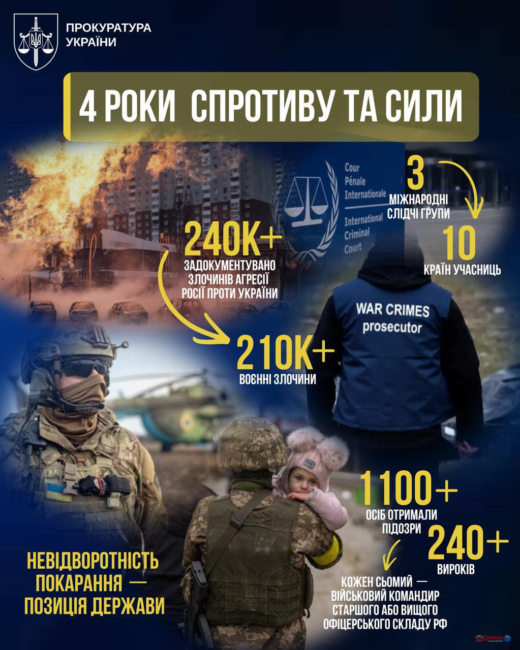 Прокурори за чотири роки задокументували понад 240 тисяч злочинів агресії РФ проти України - Кравченко Інфографіка 25.02.2026 02:24 Укрінформ Органи прокуратури за час повномасштабного російського вторгнення задокументували більш ніж 240 тисяч злочинів агресії Росії проти України. Як передає Укрінформ, про це генеральний прокурор Руслан…