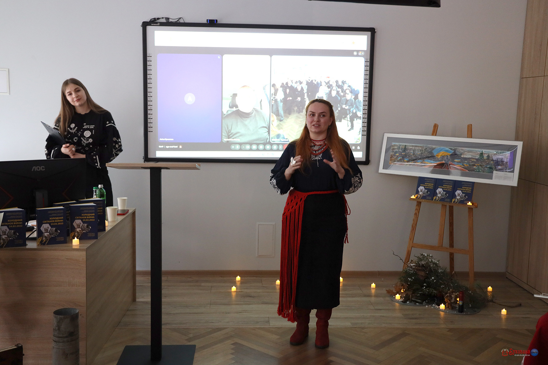 Аудиторія, в якій відбувалася презентація монографії, була оформлена з особливою делікатністю та глибоким символізмом. Простір наповнювали тематичні інсталяції – стримані, продумані до деталей, вони відтворювали атмосферу того тривожного ранку, коли звичний світ розділився на «до» і «після».