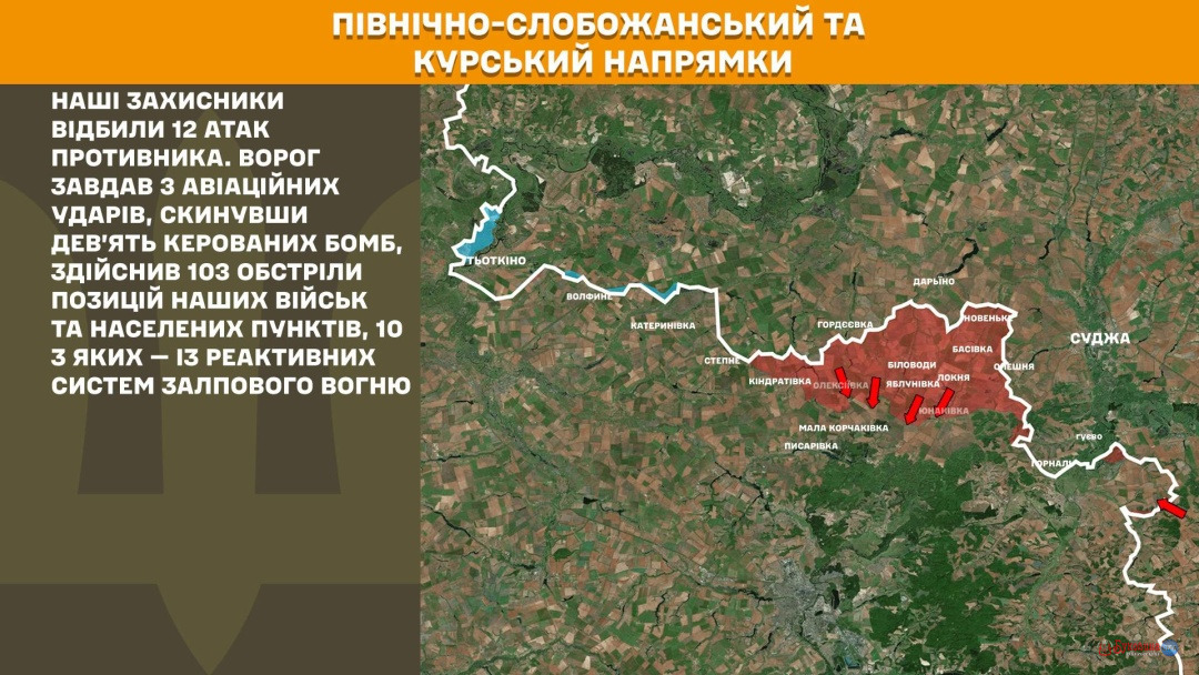 На Північно-Слобожанському і Курському напрямках Сили оборони відбили 12 ворожих атак. Загарбники завдали три авіаудари, скинувши дев’ять керованих бомб, та здійснили 103 обстріли, 10 з яких — із РСЗВ.