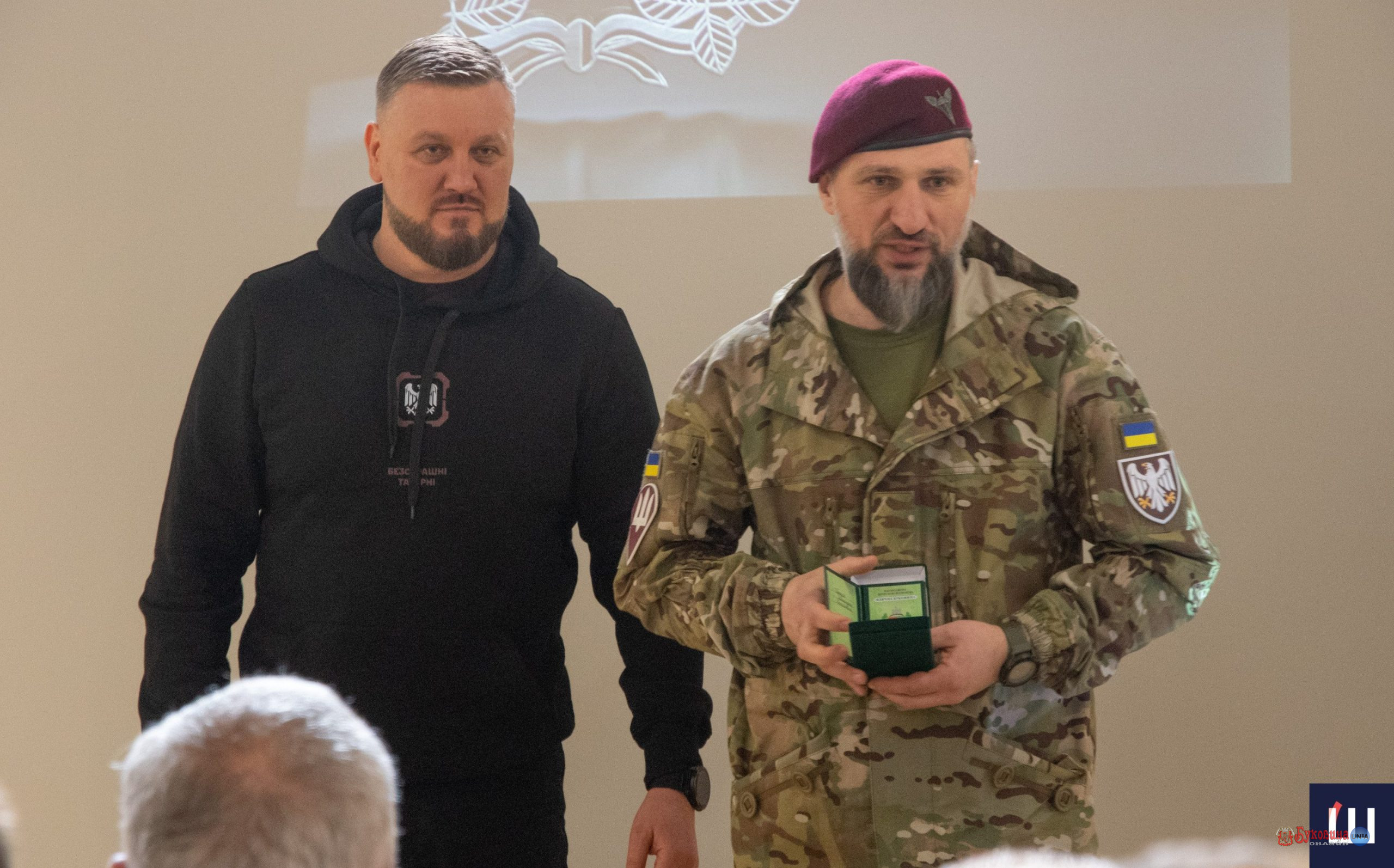 На фото військовослужбовець 82-ї окремої десантно-штурмової Буковинської бригади Олександр Білоус та голова Чернівецької ОВА Руслан Осипенко