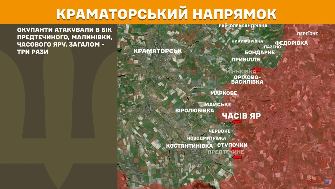 На Краматорському напрямку росіяни тричі атакували у бік Предтечиного, Малинівки й Часового Яру.