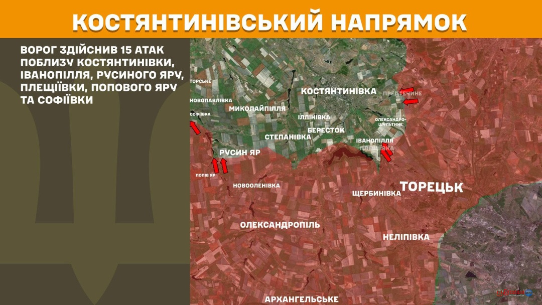На Костянтинівському напрямку ворог здійснив 15 атак поблизу Костянтинівки, Іванопілля, Русиного Яру, Плещіївки, Попового Яру та Софіївки.
