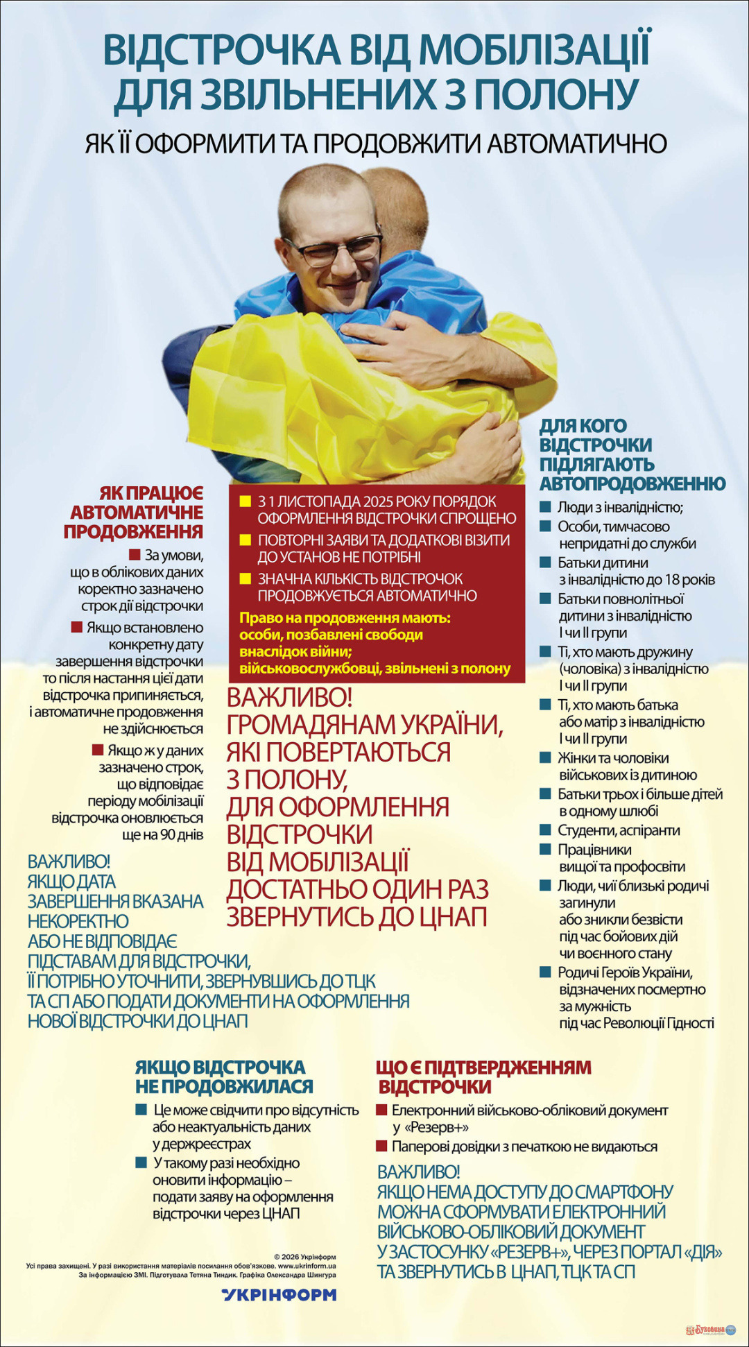 Відстрочка від мобілізації для звільнених з полону 27.02.2026 13:30 Укрінформ Як її оформити та продовжити автоматично За інформацією ЗМІ. Використано фото МВС Перше фото: В'ячеслав Мадієвський, Укрінформ Новини з передової