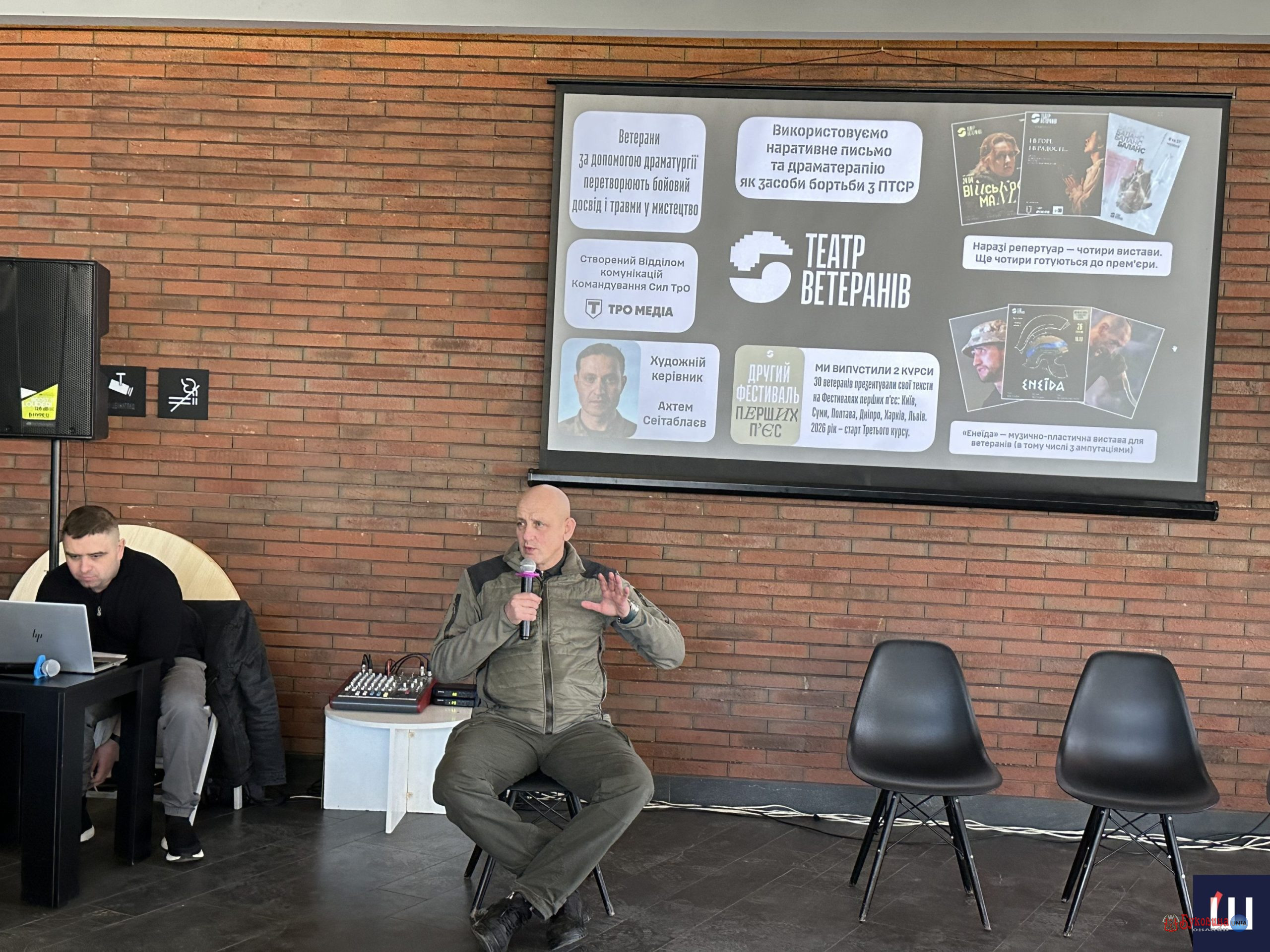 5 березня у Культурно-мистецькому центрі імені Івана Миколайчука в Чернівцях відбулася публічна дискусія «Терапія через культуру і мистецтво: досвід Театру ветеранів». Учасники заходу говорили про те, як театр допомагає військовим і ветеранам проживати травматичний досвід війни, повертатися до цивільного життя та розповідати власні історії через мистецтво.