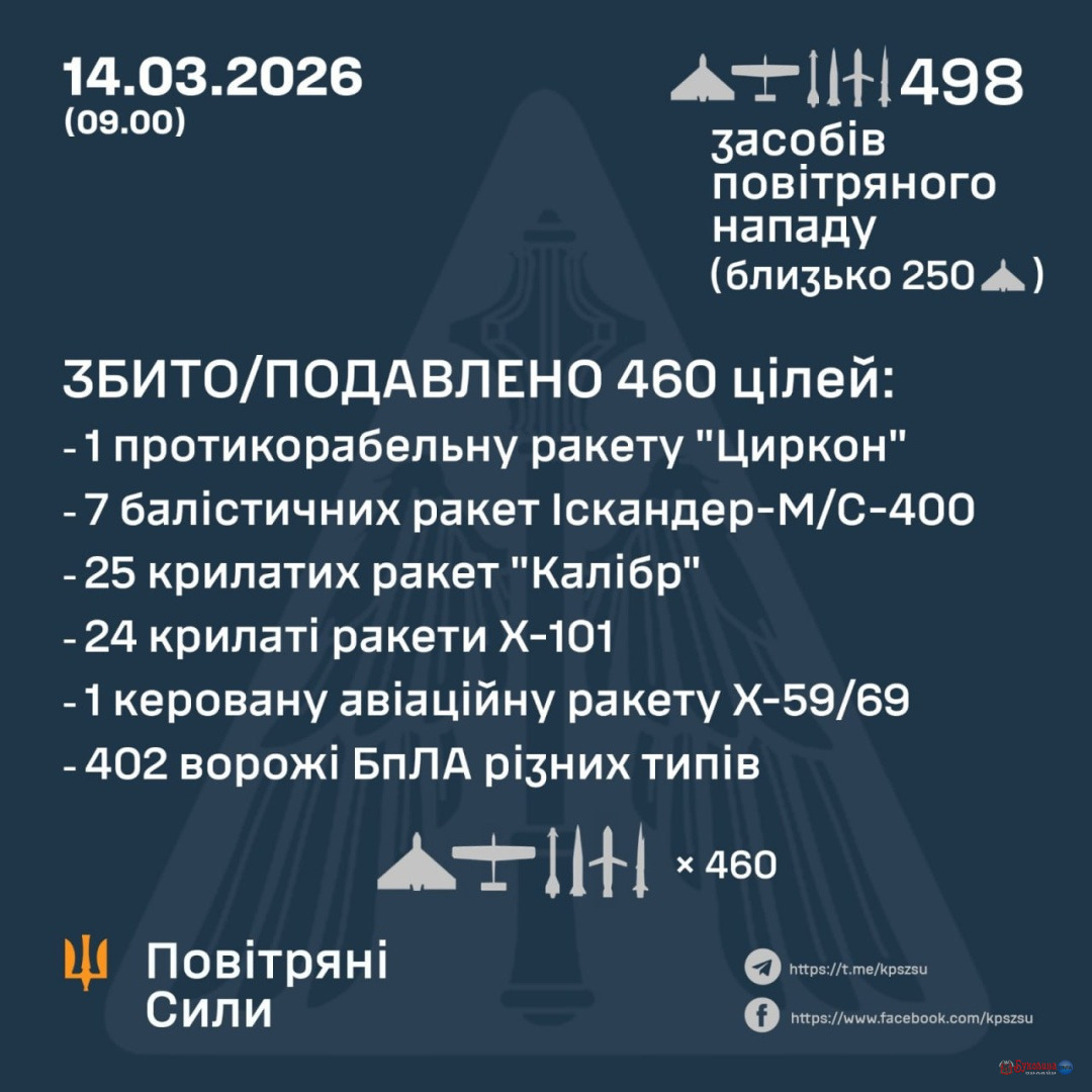 За попередніми даними, станом на 09:00 суботи, 14 березня, протиповітряна оборона збила / подавила 460 цілей – 58 ракет та 402 безпілотники різних типів: