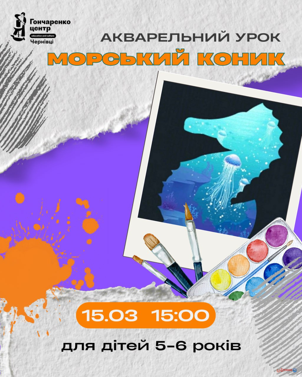 Учасники 5-6 років зможуть погратися з акварельними фарбами та намалюють морського коника.