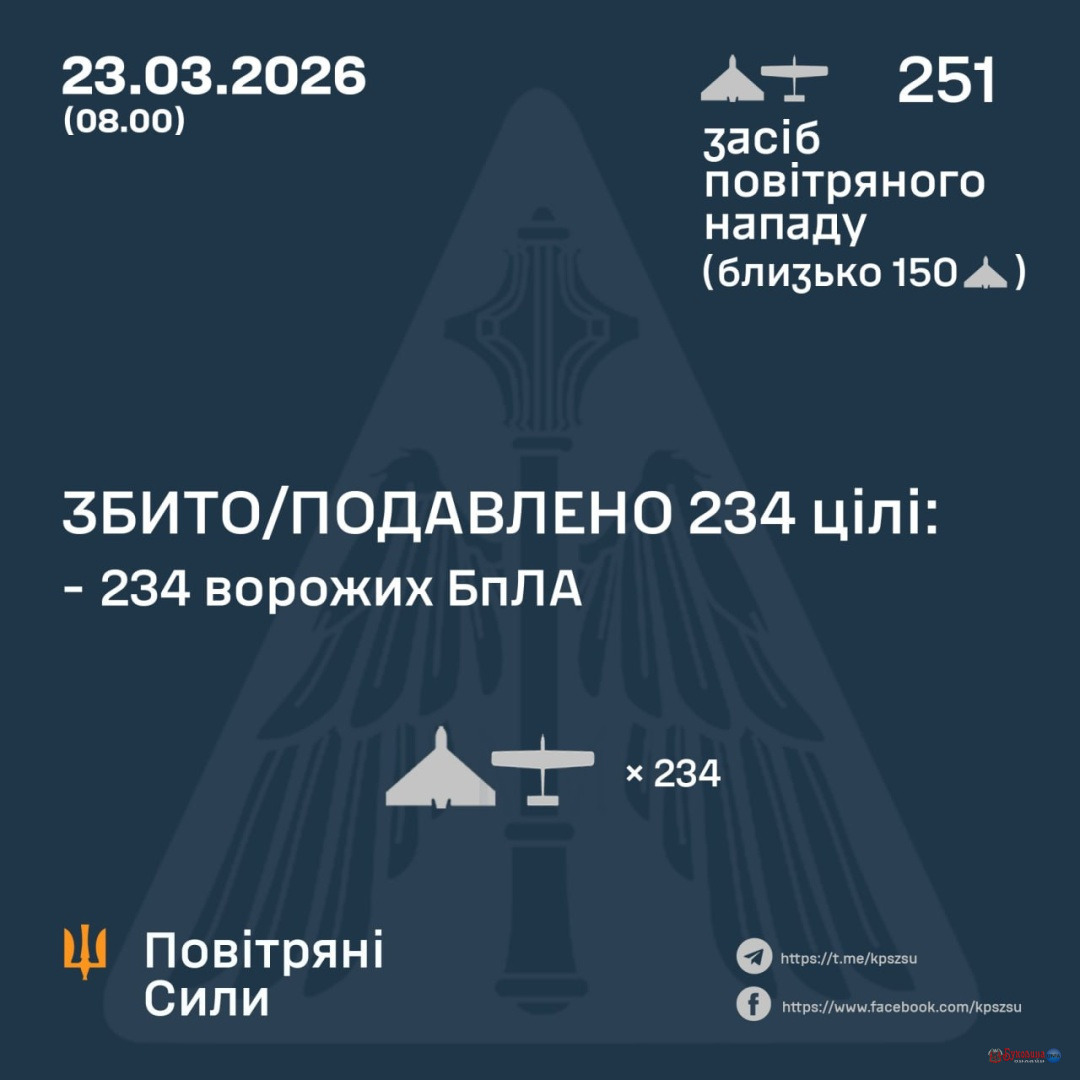 За попередніми даними, станом на 08:00 понеділка, 23 березня, ППО збила / подавила 234 БПЛА.