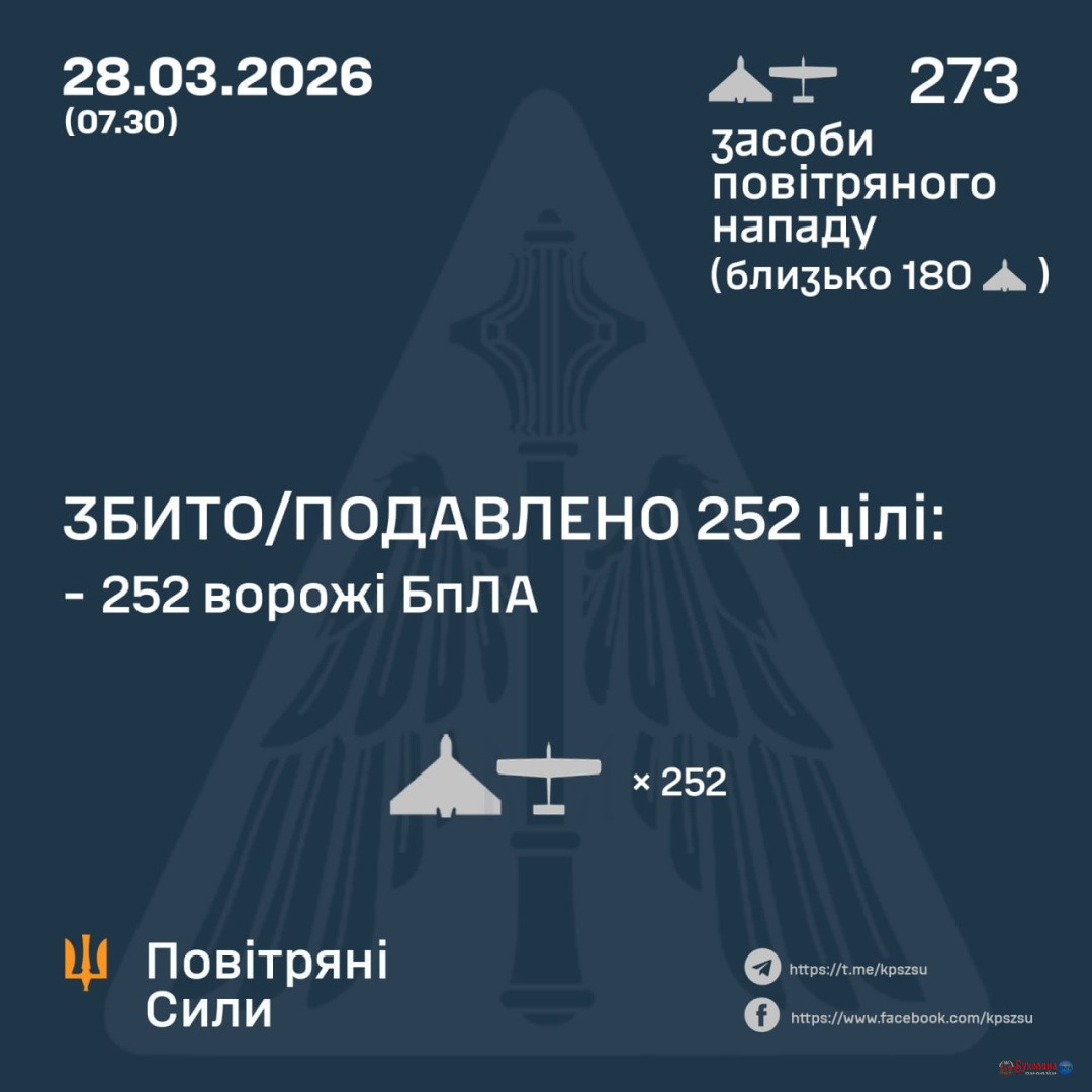 Сили протиповітряної оборони знешкодили 252 із 273 безпілотників, якими росіяни атакували Україну з вечора 27 березня.