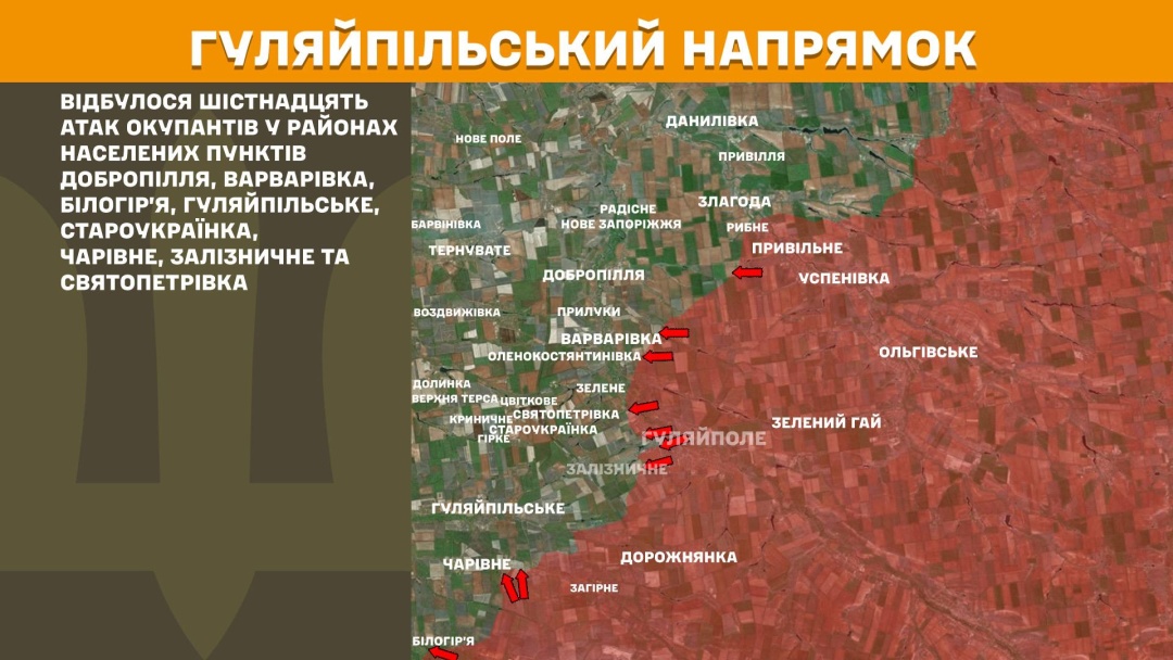 На Гуляйпільському напрямку сталося 16 російських атак у районах Добропілля, Варварівки, Білогір’я, Гуляйпільського, Староукраїнки, Чарівного, Залізничного та Святопетрівки.
